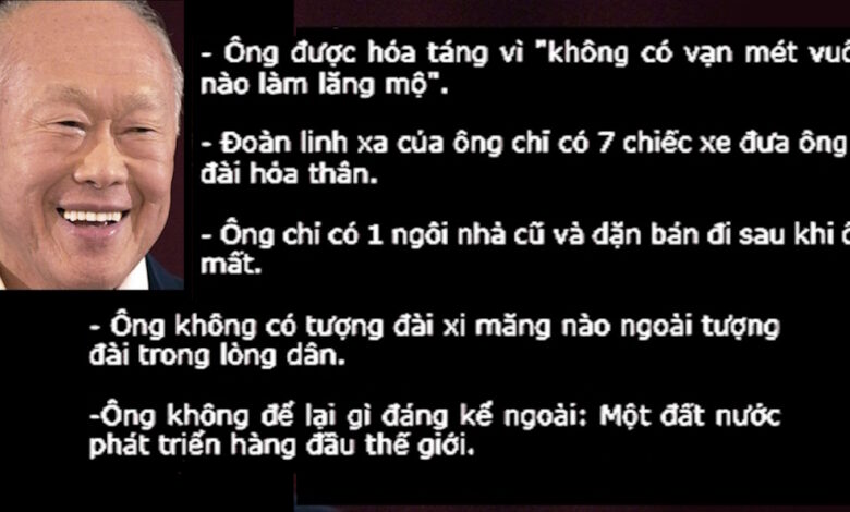 - Ông không để lại gì đáng kể ngoài một đất nước phát triển hàng đầu thế giới. Không tài sản khổng lồ, không đặc quyền. Di sản duy nhất là Singapore thịnh vượng, sạch sẽ, công bằng – nơi hàng triệu người dân được hưởng lợi.