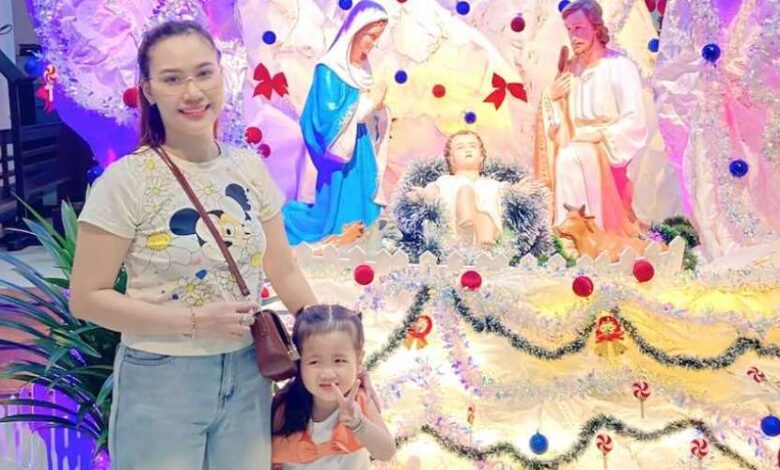 Bùi Thị Kim Thành và con gái chụp ảnh trước cảnh Chúa giáng sinh tại giáo xứ của họ ở thành phố Huế, miền trung Việt Nam, vào đêm Giáng sinh năm 2025. (Ảnh được cung cấp)