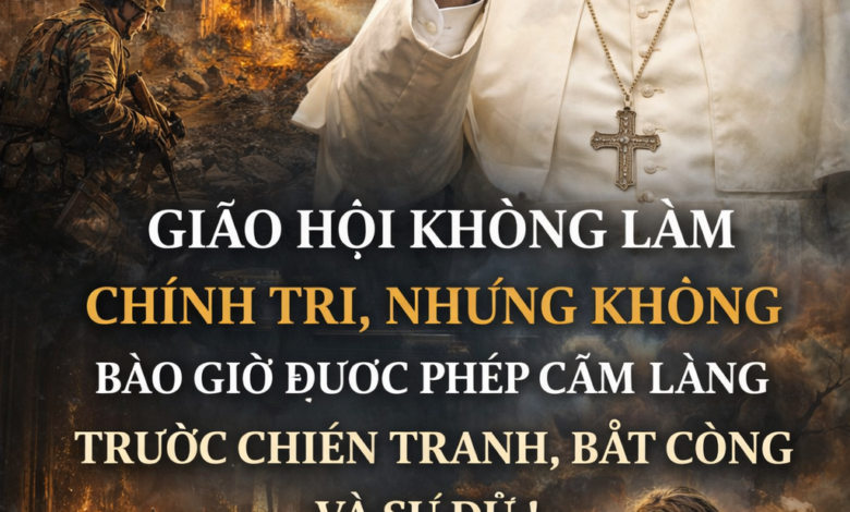 Cần phải nói điều này một cách thật rõ, thật mạnh và không úp mở nữa: Giáo Hội không làm chính trị theo nghĩa tranh đoạt quyền lực, giành ảnh hưởng, xây phe nhóm, thao túng quần chúng hay bước vào cuộc chơi của những tính toán trần thế như một tác nhân quyền lực giữa các tác nhân quyền lực khác. Nhưng cũng cần phải nói với cùng một độ rõ ràng như thế rằng chính vì Giáo Hội không làm chính trị theo nghĩa ấy, nên Giáo Hội càng không bao giờ được phép câm lặng trước chiến tranh, bất công và sự dữ. Bởi nếu Giáo Hội cũng học cách im tiếng mỗi khi con người bị nghiền nát, nếu Giáo Hội cũng bắt đầu tự kiểm duyệt mình mỗi khi chân lý gây bất tiện, nếu Giáo Hội cũng chọn sự an toàn thể chế thay cho bổn phận ngôn sứ, thì Giáo Hội sẽ không còn là Giáo Hội của Đức Giêsu Kitô nữa, mà chỉ còn là một cơ cấu tôn giáo biết tự bảo tồn mình giữa thế gian. Và đó sẽ là một thảm kịch lớn hơn bất cứ cuộc bách hại nào, bởi bách hại đến từ bên ngoài còn dễ nhận diện, còn sự câm lặng phát sinh từ bên trong lại là một hình thức mục nát âm thầm, làm hư cả linh hồn của sứ mạng.